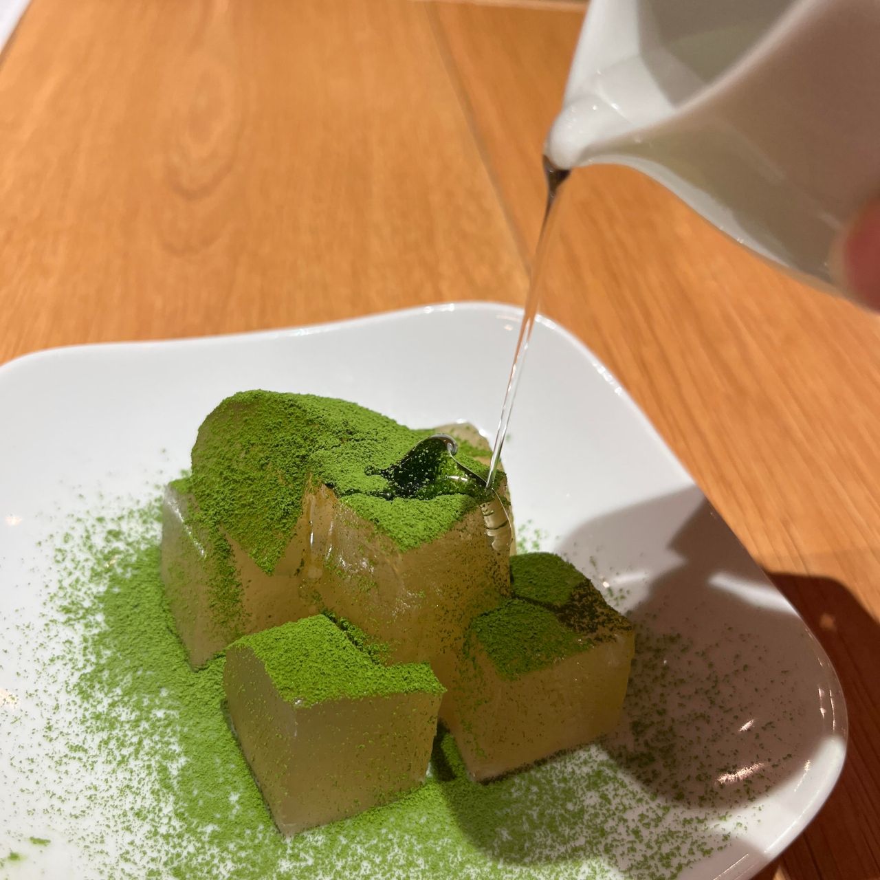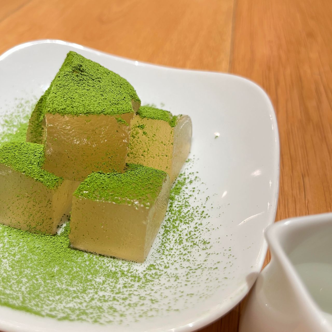 定番メニューのわらび餅は”きな粉と黒蜜”でお召し上がりいただきますが、こちらのメニューは”抹茶”がまぶされていて”白蜜”をかけてお召し上がりいただけます。