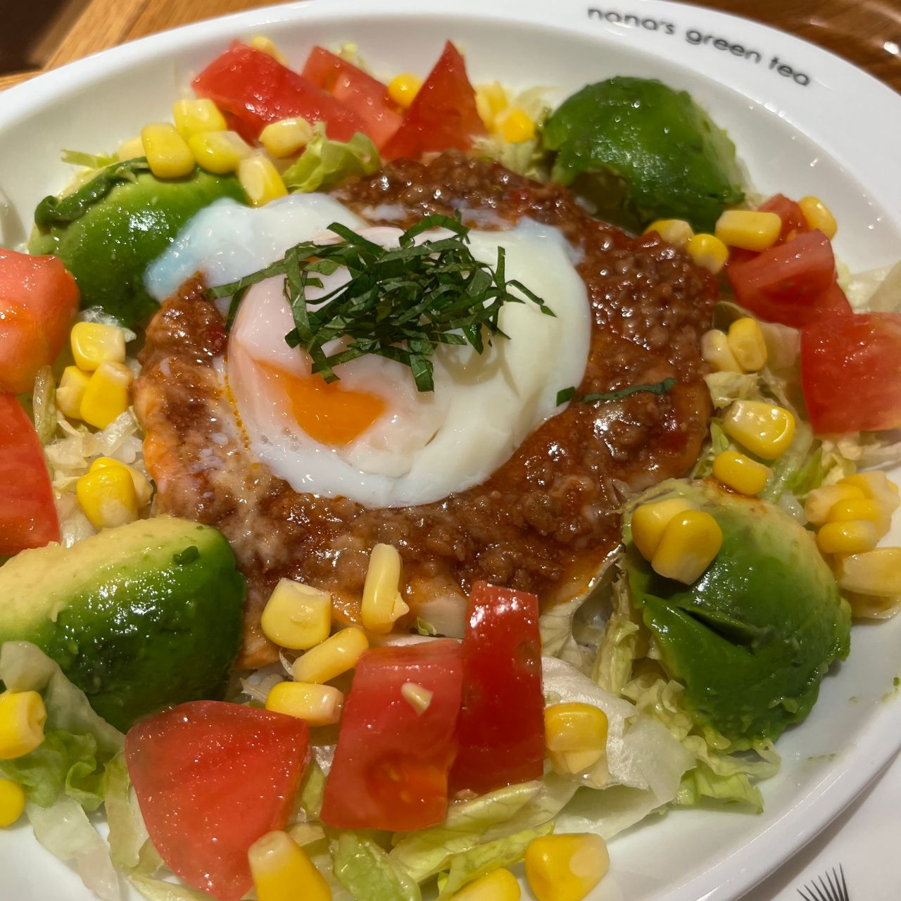 和風のエッセンスが効いたタコライスの具の他にも、アボカドやトマト、レタス、コーン、温泉卵などが入った贅沢な具だくさんメニューです♪
