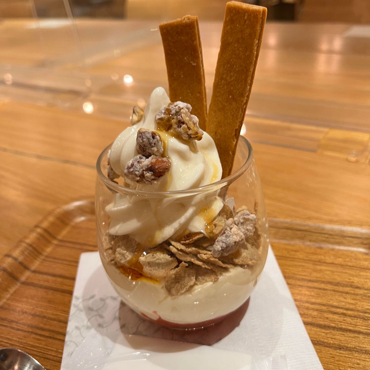 カリカリ食感のナッツは、はちみつがかかった滑らかなミルクソフトクリームと相性抜群!棒パイにつけて一緒に食べるのもおすすめです。ザクザク食感の玄米フレークと風味豊かなフロマージュクリーム、そして1番下には甘酸っぱい苺ソース。ひとつひとつの味を楽しんだら、スプーンで下まですくって一緒に食べてみて下さいね。