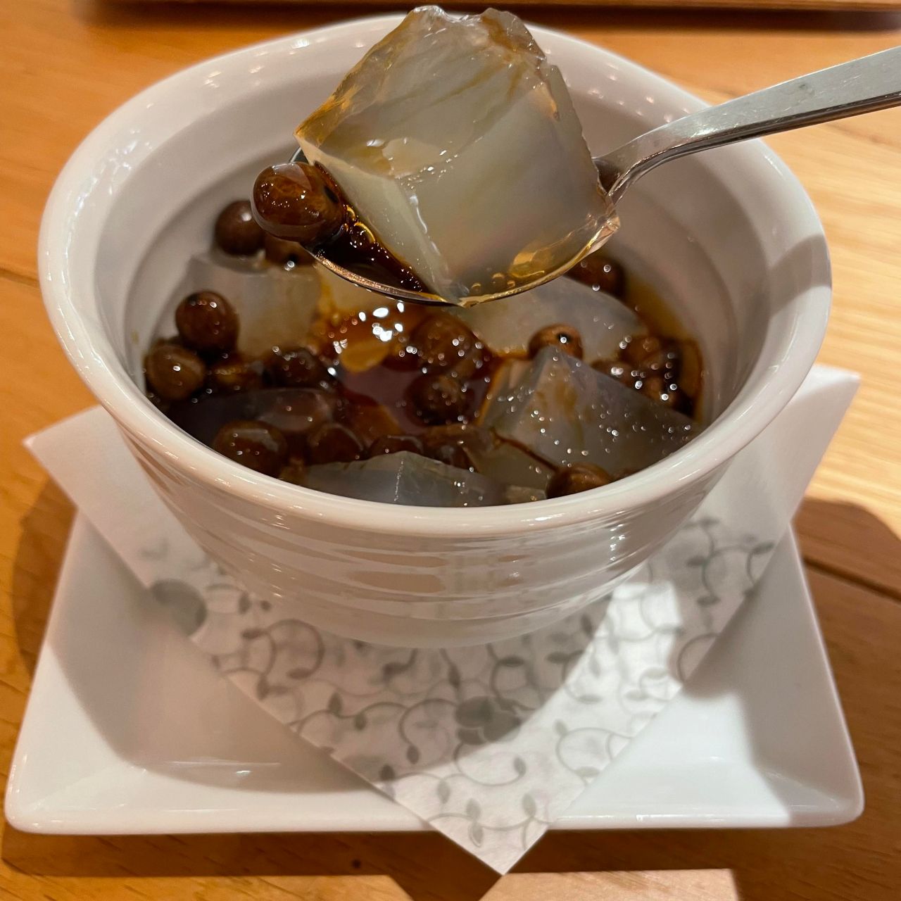 わらび餅のもちもち感とは反対に噛めばほろほろとくずれていく寒天と、香ばしい赤豆、黒蜜の組み合わせはシンプルながらも食感や風味を十分にお楽しみいただけます。