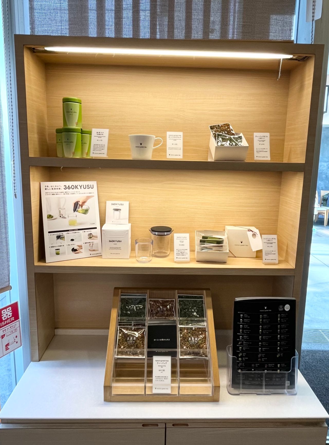 たまプラーザテラス店では、店内入ってすぐ右に物販商品の並ぶ棚があります。