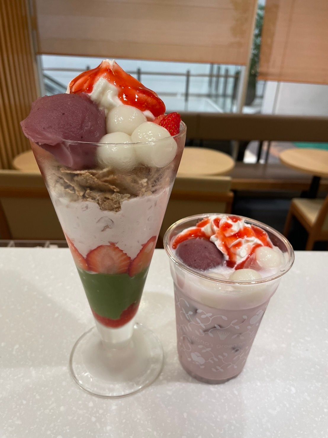 可愛いピンクが特徴の、春色パフェとドリンク。