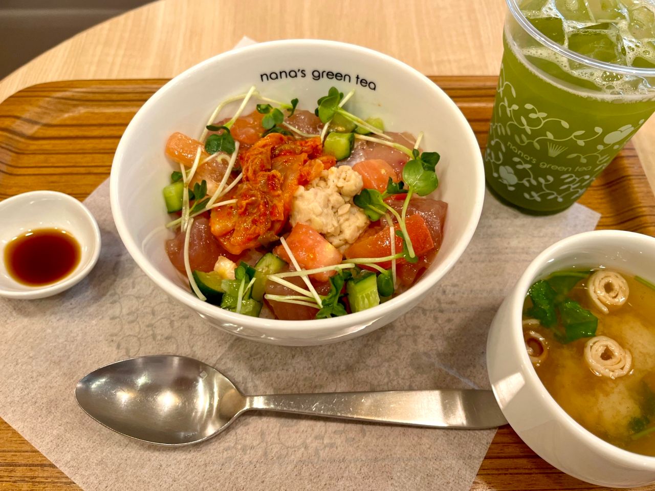 漬け鮪とたっぷりの夏野菜の上に、キムチ・納豆を乗せたボリューム満点のどんぶりです!