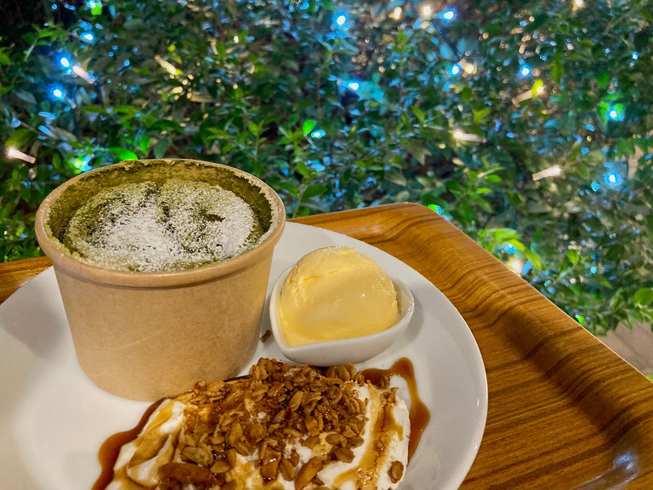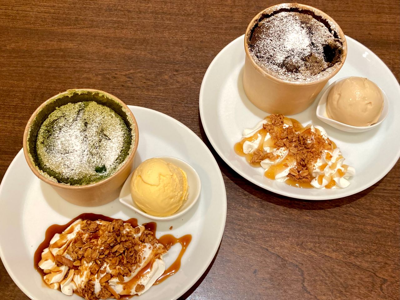 抹茶シフォンにはバニラアイス、ほうじ茶シフォンにはキャラメルアイスが添えてあります。このプレートでしか登場しないキャラメルアイスはおすすめです!