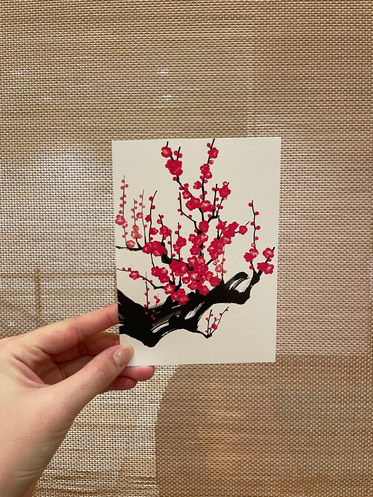 可愛らしく、華華しい梅の花とどっしりと動きのある木の枝の差が感じられるとても美しい1枚です。