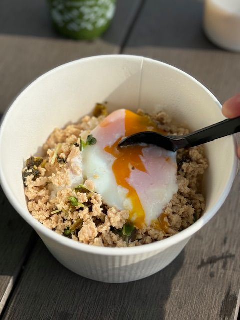 あとはお客様ご自身で、ご飯に乗せて、トッピングの温玉も載せれば