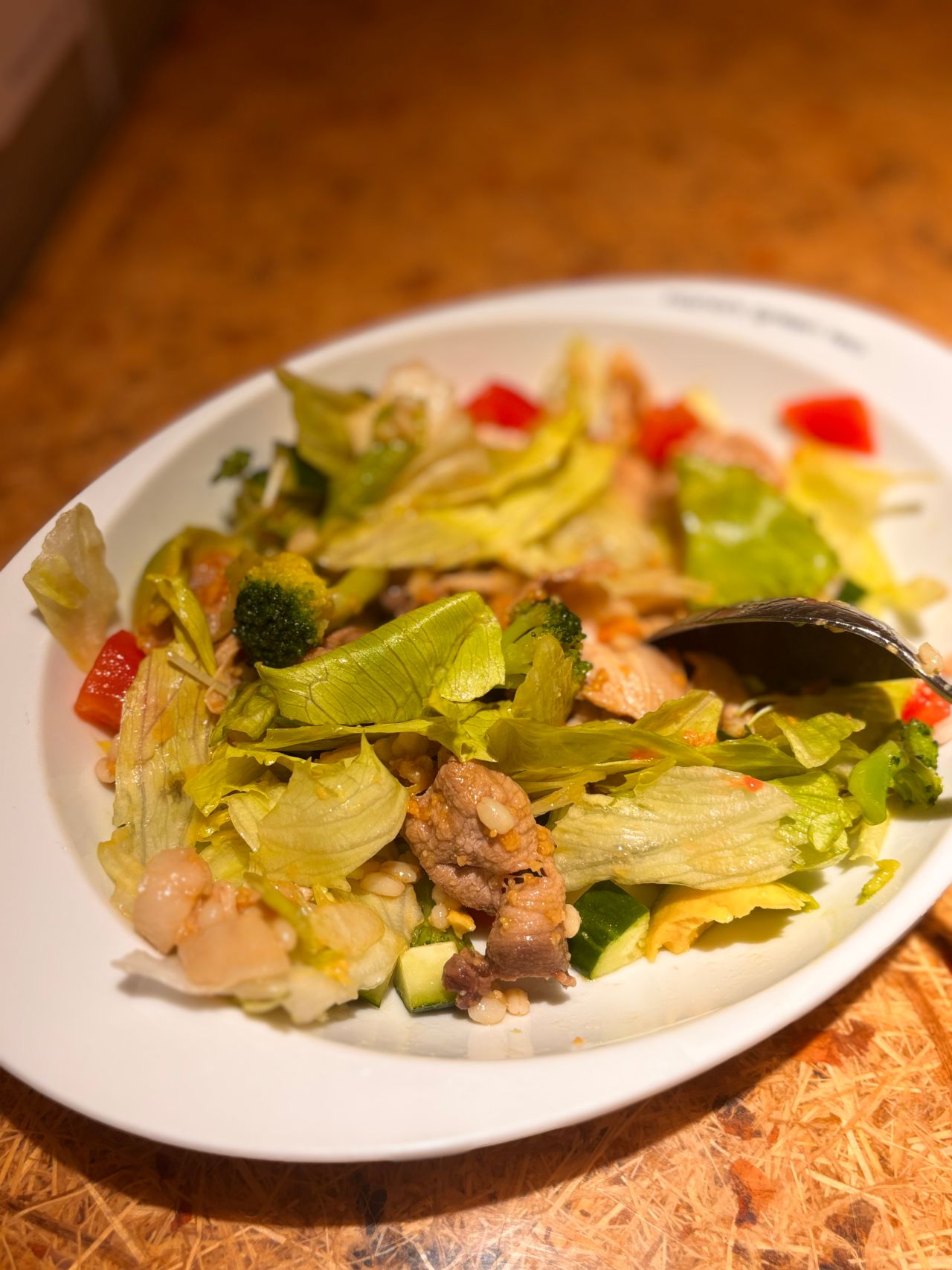 いつも通り、醤油麹ドレッシングをすべてかけて、見た目など気にせずグワッと混ぜちゃいます