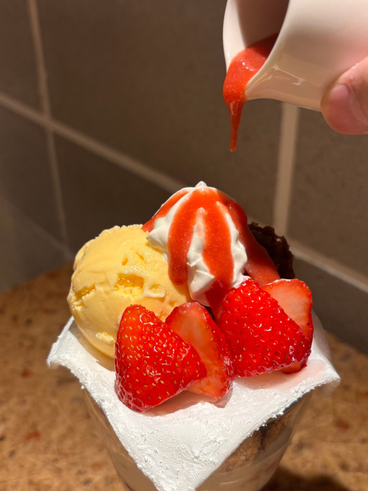 別添えの苺100%ソースをかけようものならば、上も下も苺まみれな上に、食べ進めていくと、下のほうには、粒白玉が入っていたりと、どこまでも飽きさせ無い工夫がほどこされています