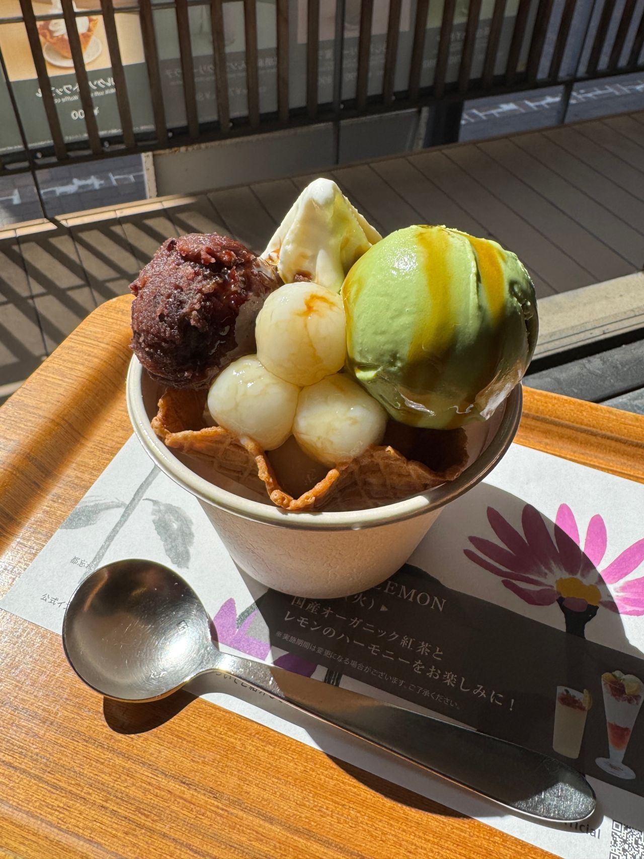 ワッフルコーンの香ばしさに、もちもちの白玉と